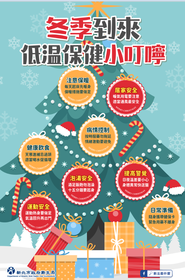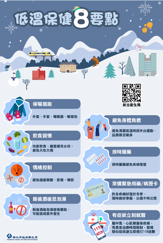 1.保暖:居家臥室、衛浴與客廳要做好防寒與安全措施。處在低溫或外出時,一定要做好完整的保暖,尤其注意頭頸部及四肢末端,善用圍巾、帽子、口罩、手套、襪子、防滑鞋,及多層次保暖衣物等,方便穿脫。